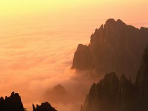 云海玉盤----泰山云霧可謂呼風喚雨,變換無窮:時而山風呼嘯,云霧彌漫,如墜混沌世界;俄頃黑云壓城,地底興雷,讓人魂魄震動,游人遇此,無須失望,因為你將要見到云海玉盤的奇景:有時白云滾滾,如浪似雪;有時烏云翻騰,形同翻江倒海;有時白云一片,宛如千里棉絮;有時云朵填谷壑,又象連綿無垠的汪洋大海,而那座座峰巒恰似海中仙島。站在岱頂,俯瞰下界,可見片片白云與滾滾烏云而融為一體,匯成滔滔奔流的“大!,妙趣橫生,又令人心朝起伏。